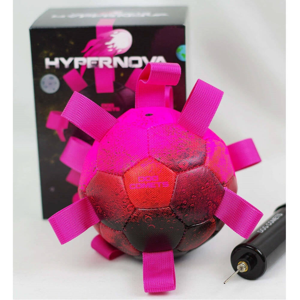 Dog Comets Hypernova je kožna nogometna lopta za pse s najlonskim trakicama koje olakšavaju bacanje, podizanje, nošenje i igre povlačenja. Ova visokokvalitetna lopta sastoji se od tri sloja i stoga je izuzetno čvrsta. Unutarnji dio izrađen je od gume, okružena slojem pamuka, a vanjska je od PU materijala. To lopti daje mekoću i izdržljivost i čini da dobro odskače. Sigurna za pseće zube, a zbog petlji savršena za donošenje i bacanje. Lopta se lako može napuhati pomoću pumpe.