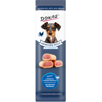 Dokas mekane punjene poslastice za pse s punjenjem od filea pilećih prsa i pačetine.
