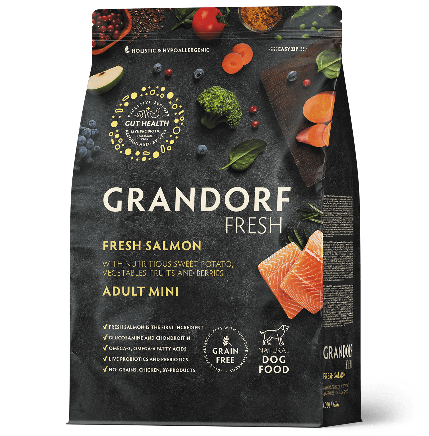 Grandorf Fresh Mini Losos je suha hrana za odrasle pse malih pasmina (mini breed), napravljena s puno svježeg mesa lososa i puretine. Hipoalergena i lako probavljiva.