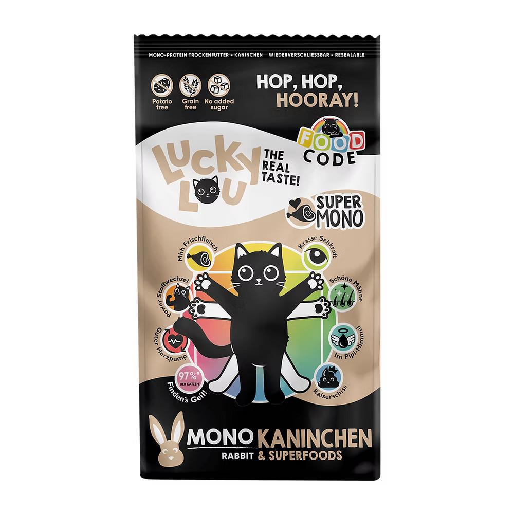 Lucky Lou Monoprotein Kunić je visokokvalitetna suha hrana za mačke koja sadrži 44% mesa kunića (24% svježeg i 20% sušenog). Obogaćena je tapiokom, graškom, mrkvom, lanenim sjemenkama, pivskim kvascem, mačjom travom i cikorijom. Ova monoproteinska hrana za mačke bez žitarica, glutena, šećera, konzervansa i GMO-a, obogaćena je vitaminima i mineralima, uključujući taurin, te je idealna za mačke s osjetljivim probavnim sustavom. Tražiš ukusnu, kvalitetnu i lako probavljivu hranu za svoju mačku? Biraj Lucky Lou!