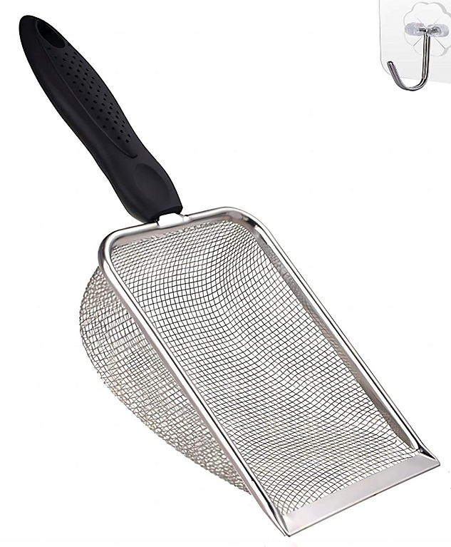 🔹 Metalna mrežica fino filtrira, zadržava izmet i grudice, a čisti pijesak vraća natrag u posudu