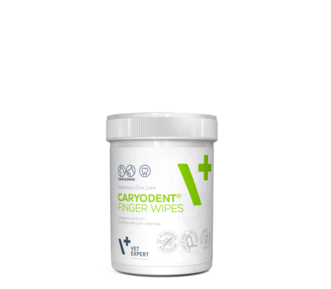 Vet Expert Caryodent maramice za pranje zuba za pse i mačke imaju posebnu teksturu s nježnim izbočinama koja nježno masira zube i desni, mehanički čisti površinu zuba, a drugi sastojci pozitivno djeluju na oralni mikrobiom i sprječavaju nastanak plaka i kamenca.